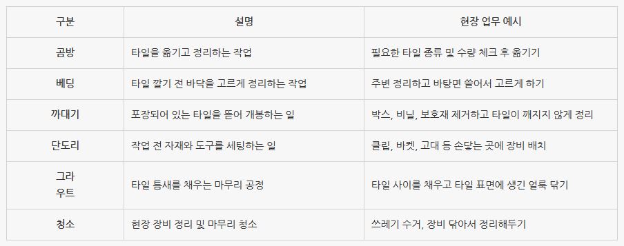 ¿À´ÃÀº ÈÞ°ÇÃà±â¼úÇпø ±¤ÁÖ 26±â Á¹¾÷»ý ±è*¿í´ÔÀÇ ½ÇÁ¦ È£ÁÖ¿öȦÈı⸦ ÅëÇØ, ½ÇÁ¦ È£ÁÖ¿öȦŸÀÏ Á÷¾÷ ÇöÀåÀÌ ¾î¶²Áö, ¾î¶² ÀÏÀ» ÇÏ°Ô µÇ´ÂÁö, ±×¸®°í ¾÷¹« ¿Ü È£ÁÖ¿öȦ»ýȰÀº ¾î¶²Áö±îÁö ¼ÖÁ÷ÇÏ°í ´ã¹éÇÏ°Ô Àü´ÞÇØ µå¸®°Ú½À´Ï´Ù. Çѱ¹¿¡¼ÀÇ ±â´ë vs È£ÁÖ ÇöÀåÀÇ Çö½Ç "Àú´Â ±¤ÁÖ¿¡¼ 3°³¿ù°£ ŸÀÏ ±³À°À» ¸¶Ä¡°í, È£ÁÖ¿¡ ¿Ô°í ¹ú½á 5ÁÖ Â÷°¡ µÇ¾ú½À´Ï´Ù." È£ÁÖ¿¡ ¿À±â Àü¿¡´Â È£ÁÖ ÇöÀå¿¡¼´Â ±â¼úÀÚ µÚ¿¡¼ º¸Á¶ÇÏ¸é¼ ÀÏÀ» ¹è¿ì°í, °£´ÜÇÑ Å¸Àϸµ±îÁö ÇÒ ¼ö ÀÖ°ÚÁö¶ó´Â »ý°¢À» Çß½À´Ï´Ù. È£ÁÖ °Ç¼³ ÇöÀå¿¡ ´ëÇÑ À̾߱⵵ ºí·Î±×³ª À¯Æ©ºê·Î ¸¹ÀÌ Ã£¾ÆºÃ°í¿ä. ¾ÈÀüÇϰí È¿À²ÀûÀÎ ½Ã½ºÅÛ ±×¸®°í ³ôÀº ½Ã±ÞÀ¸·Î µ·µµ ¸¹ÀÌ ¹ú°í, ÀÚÀ¯·Î¿î »ýȰÀ» Çϸç Áö³¾ ¼ö ÀÖÀ» °Å¶ó »ý°¢ÇßÁÒ. ±Ùµ¥ ¸·»ó È£ÁÖ¿¡ ¿Í¼ º¸´Ï, Çö½ÇÀº »ý°¢°ú´Â ¸¹ÀÌ ´Þ¶ú½À´Ï´Ù. ±â¼úÀÚ¿Í Á÷Á¢ ºÙ¾î ´Ù´Ï¸ç ¹è¿ì´Â °æ¿ì´Â °ÅÀÇ ¾ø°í, ÁÖ·Î ¸Ã°Ô µÇ´Â °Ç µ¥¸ðµµÀÔ´Ï´Ù. µ¥¸ðµµ´Â ŸÀÏ ±â¼úÀÚ º¸Á¶¸¦ ¸»ÇØ¿ä. ÇöÀå¿¡¼ ±â¼úÀÚ¸¦ µµ¿Í Àåºñ¸¦ ¼¼ÆÃÇϰí ÇöÀåÀ» Á¤µ·ÇÏ´Â ÀÏÀ» ÇØ¿ä. ½±°Ô ¸»Çؼ´Â 'ÀâÀÏ'ÀÌ¶ó º¼ ¼ö ÀÖÁö¸¸, ÀÌ·± ÀÏÀ» ÇÏ´Â ÀÌÀ¯´Â °á±¹ ±â¼úÀÚ°¡ µÇ±â À§ÇÑ ÈÆ·Ã °úÁ¤À̶ó°í »ý°¢ÇÏ¸é µË´Ï´Ù. ÀÏÁÖÀÏ ³»³» ±â¼úÀÚ ¿·¿¡¼ ÀÏÇÏ´Â °Ô ¾Æ´Ï¶ó, 3~4ÀÏÀº °õ¹æ°ú º£µù, ³ª¸ÓÁö´Â ±×¶ó¿ìÆ® ÀÏÁ¤ÀÌ ÀâÇôÀÖ´Â ½ÄÀÔ´Ï´Ù. ±â¼úÀںе鵵 º»Àεé ÀÏÇÏ´À¶ó ³Ê¹« ¹Ùºü¼ Çпø¿¡¼Ã³·³ Ä£ÀýÇÏ°Ô °¡¸£ÃÄ ÁÖ½ÃÁö´Â ¸øÇØ¿ä. "°¡¸£ÃÄ ÁÖ°í ½Í¾îµµ ±×·² ½Ã°£ÀÌ ¾ø¾î¿ä" °á±¹ ½º½º·Î ´«Ä¡²¯ º¸°í, ¿òÁ÷ÀÌ¸é¼ ¹è¿ö¾ß ÇÕ´Ï´Ù. µ¥¸ðµµÀÇ ÇÏ·ç´Â ü·Â°úÀÇ ½Î¿ò µ¥¸ðµµ·Î ÀÏÇÏ´Ù º¸¸é ÇÏ·ç°¡ ±Ý¹æ Áö³ª°¡¹ö¸³´Ï´Ù. ¿¹¸¦ µé¾î À̹ø ÁÖ ¼ö¿äÀÏ ÇöÀå¿¡¼´Â ¾ÆÄ§¿¡ Ãâ±ÙÇÏÀÚ¸¶ÀÚ ÆÄ¿ì´õ·ë û¼ÒÇÏ°í ±×¶ó¿ìÆ® ÀÛ¾÷À» Çß½À´Ï´Ù. Áß°£ ±â¼úÀÚ¶û °°ÀÌ 2½Ã°£ ¹Ý Á¤µµ¸¦ ÀÛ¾÷Çߴµ¥, ±× »çÀÌ¿¡¸¸ ¹«·Á 6ÆÈ·¹Æ®¸¦ ¿Ã·È½À´Ï´Ù. ¶Ç ¸ñ¿äÀÏ¿¡´Â ¸¶ÀÌÅÍ °øÀåÀÌ °¡µ¿µÇ¾ú´Âµ¥¿ä. Á¦°¡ °øÀåÀ̶ó°í Ç¥ÇöÇÏ´Â ÀÌÀ¯´Â, ¸» ±×´ë·Î °øÀåó·³ ¸¶ÀÌÅ͸¸ Ãij»´Â ÀÛ¾÷À» Çϱ⠶§¹®ÀÔ´Ï´Ù. Ãâ±ÙÇÏÀÚ¸¶ÀÚ À̰ÍÀú°Í Àâ´ÙÇÑ ÀϵéÀ» ÇÏ¸ç ¸¶ÀÌÅ͸¦ ³¯¸®´Ù º¸¸é ÇÏ·ç°¡ ³¡³³´Ï´Ù. ÀÎÀå 80ÀåÀº °Å¶áÈ÷ ³Ñ°Ô ÇÑ °Í °°¾Æ¿ä. ¤»¤»¤»¤»¤» Æäµ¥½ºÅ» ŸÀÏ °õ¹æÀ» ÇÏ´Ù°¡ 30kgÂ¥¸® ŸÀÏÀ» µé¸é, ¿Í ÁøÂ¥ °³²Ü ÇýÀÚ½º·´´Ù ½Í½À´Ï´Ù. ±×¸¸Å ü·ÂÀÌ ¹ÞÃÄÁà¾ß ¹öÆ¿ ¼ö ÀÖ´Â ÀÏÀÔ´Ï´Ù. °á·ÐÀº Çϳª, È£ÁÖ¿öȦŸÀÏ·¯´Â ü·ÂÀÌ ÀÖ¾î¾ß ¹öÆ¿ ¼ö ÀÖ´Â Á÷¾÷À̶ó´Â °Ì´Ï´Ù. µ¥¸ðµµ¶õ? - È£ÁÖ Å¸ÀÏ ÇöÀåÀÇ ±âº» of ±âº» ¾Æ±îµµ Àá±ñ ¼³¸íÇßÁö¸¸, È£ÁÖ Å¸ÀÏ ÇöÀå¿¡¼ ¾²ÀÌ´Â 'µ¥¸ðµµ'¶ó´Â Ç¥ÇöÀº ½±°Ô ¸»ÇØ Å¸ÀÏ º¸Á¶ ¾÷¹«ÀÔ´Ï´Ù. ±â¼úÀÚ°¡ ŸÀÏÀ» ºÙÀÌ´Â µ¿¾È °õ¹æ(ŸÀÏ ¿Å±â±â), º£µù(¹Ù´Ú °í¸£±â), ±î´ë±â(ŸÀÏ Æ÷Àå ¹þ±â±â), û¼Ò °°Àº ŸÀÏ ¾÷¹«¿Í °ü·ÃµÈ ¸ð~~~~~µç ÀÏÀ» ´ã´çÇÑ´Ù°í º¸½Ã¸é µË´Ï´Ù. Çѱ¹¿¡¼ °Ç¼³ ÇöÀåÀÇ '¸·³»' ¿ªÇÒ°ú ºñ½ÁÇÏÁö¸¸, ´Ü¼øÇÑ ÀâºÎ°¡ ¾Æ´Ï¶ó 'ŸÀÏ ÇöÀåÀ» ¹è¿ì°í ÀÍÈú ¼ö ÀÖ´Â ¼ö·Ã»ý' °°¾Æ¿ä. ŸÀÏ ±â¼úÀ» ¹è¿ì±ä Ç߾, º¹Àâ ´Ù¾çÇÑ ÇöÀå¿¡¼ ½ÇÁ¦·Î °ðÀå Àû¿ëÇϱâ´Â ¾î·Æ½À´Ï´Ù. ±×·¡¼ ±â¼úÀÚ¸¦ µû¶ó´Ù´Ï¸ç ´Ù¾çÇÑ ÇöÀåÀ» °æÇèÇÏ°í ¹è¿ì´Â °úÁ¤ÀÌ ÇÊ¿äÇÏÁÒ. µ¥¸ðµµ´Â È£ÁÖŸÀÏ ÇöÀå¿¡¼ ²À ÇÊ¿äÇÑ °úÁ¤ - ±â¼úÀÚ, Áß°£ ±â¼úÀÚ°¡ µÇ±â À§ÇØ ¹Ýµå½Ã °ÅÃÄ¾ß ÇÏ´Â °úÁ¤ - ü·Â°ú ´«Ä¡, ±â·Ï ½À°üÀÌ ÀÖ¾î¾ß ºü¸£°Ô ¼ºÀåÇÒ ¼ö ÀÖ´Â ½Ã±â ÀÌ·¸°Ô º¸¸é µ¥¸ðµµ¶ó´Â ÀÏÀº ´Ü¼øÈ÷ Àâ´ÙÇÑ ÀÏÀ» ÇѴٱ⺸´Ù´Â ŸÀÏ ÇöÀåÀÌ Àß ±¼·¯°¡°Ô ¸¸µé¾îÁÖ´Â ÇÙ½É Áö¿ø ¿ªÇÒÀ̶ó´Â °É ¾Ë ¼ö ÀÖ½À´Ï´Ù. ±×·±µ¥, È£ÁÖ¿öȦ·¯»Ó¸¸ ¾Æ´Ï¶ó È£ÁÖ ÇöÀå¿¡¼ "µ¥¸ðµµ¸¸ ÇØ¼´Â µ·À» ¸ø ¹ø´Ù"¶ó´Â ¸»ÀÌ ÀÖ½À´Ï´Ù. ÇÏÁö¸¸, µ¥¸ðµµ¸¦ ÇÏÁö ¾Ê°í ±â¼úÀÚ³ª Áß°£±â¼úÀÚ°¡ µÇ´Â ÀÏÀº ¾ø½À´Ï´Ù. µ¥¸ðµµ ±â°£ÀÌ ¾ó¸¶³ª ±æ°í ªÀºÁö´Â ÀÚ±â ÀÚ½ÅÀÇ ¿ª·®¿¡ µû¶ó ´Ù¸¨´Ï´Ù. µ¥¸ðµµ ±â°£¿¡´Â ±â¼úÀ» ¹è¿ì°í, °æÇèÀ» ½×°í, ¼ºÀåÀÇ ¹ßÆÇÀ» ¸¶·ÃÇÏ´Â ½Ã°£ÀÔ´Ï´Ù. Áß¿äÇÑ ½Ã°£Àε¥, ¸¹Àº ºÐµéÀÌ ÀÌ ½Ã±â¸¦ ºü¸£°Ô ¹þ¾î³ª°í ½Í¾î ÇØ¿ä. Áß°£±â¼úÀÚÀÇ ¿ª·®À» °®ÃßÁö ¸øÇߴµ¥, °ð¹Ù·Î Áß°£±â¼úÀÚ°¡ µÇ¾î¹ö¸®¸é °á±¹ ÇöÀå¿¡¼ ã¾ÆÁÖÁö ¾Ê½À´Ï´Ù. µ¥¸ðµµ·Î¼ °®