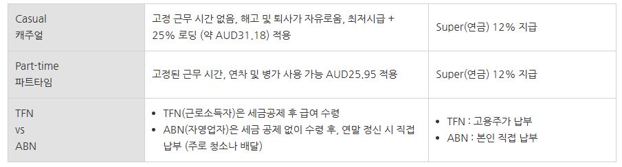 💰 ÀλóµÈ ÃÖÀú ½Ã±Þ°ú °í¿ë À¯Çü 2025³â 7¿ù 1ÀϺÎÅÍ È£ÁÖÀÇ ÃÖÀú ÀÓ±ÝÀº ½Ã°£´ç AUD24.95·Î ÀλóµÇ¾ú½À´Ï´Ù. ±×·¸Áö¸¸ ¿öȦ·¯´Â °í¿ë ÇüÅ¿¡ µû¶ó ½Ã±ÞÀÌ ´Þ¶óÁö´Ï ¹Ýµå½Ã È®ÀÎÇØ¾ß ÇÕ´Ï´Ù. 💡 È£ÁÖ ÇöÁö ²ÜÆÁ ÇöÁö¿¡¼ Çö±Ý(Cash in Hand)À¸·Î ½Ã±Þ AUD$20 ÀÌÇϸ¦ Á¦¾ÈÇÏ´Â °÷Àº ºÒ¹ýÀÔ´Ï´Ù. ±Þ¿© ¸í¼¼¼(Payslip)¸¦ ¿ä±¸Çϰí TFNÀ¸·Î Á¤´çÇÑ °è¾àÀ» ¸Î¾î¾ß ¿¬±Ý ¹× ¼¼±Ý ÇýÅÃÀ» ¹ÞÀ» ¼ö ÀÖ½À´Ï´Ù. ¿¬±Ý(Superannuation)Àº 12%°¡ º°µµ·Î Àû¸³µË´Ï´Ù. 📜 È£ÁÖ ¿öȦ·¯ Çʼö ID - TFN ½Åû ¹× ºñÀÚ - TFN(Tax File Number) : È£ÁÖ¿¡¼ ÇÕ¹ýÀûÀ¸·Î ÀÏÇÏ°í ¼¼±ÝÀ» ³³ºÎÇϱâ À§ÇÑ °³ÀÎ ½Äº° ¹øÈ£ÀÔ´Ï´Ù. È£ÁÖ µµÂø ÈÄ È£ÁÖ ±¹¼¼Ã»(ATO) À¥»çÀÌÆ®¿¡¼ ¿Â¶óÀÎÀ¸·Î ½Åû °¡´ÉÇÕ´Ï´Ù. (¾à 28ÀÏ ¼Ò¿ä) - ºñÀÚ È®ÀÎ : °ü±¤ºñÀÚ(ETA)·Î ÀÔ±¹ÇÏ´Â °æ¿ì 3°³¿ù À̳»¿¡ ÀÏÀ» ½ÃÀÛÇÏ¸é ºÒ¹ýÀÔ´Ï´Ù. ¿öŷȦ¸®µ¥ÀÌ ºñÀÚ(Subclass 417) ¶ó¸é ²À È®ÀÎÇϼ¼¿ä.
