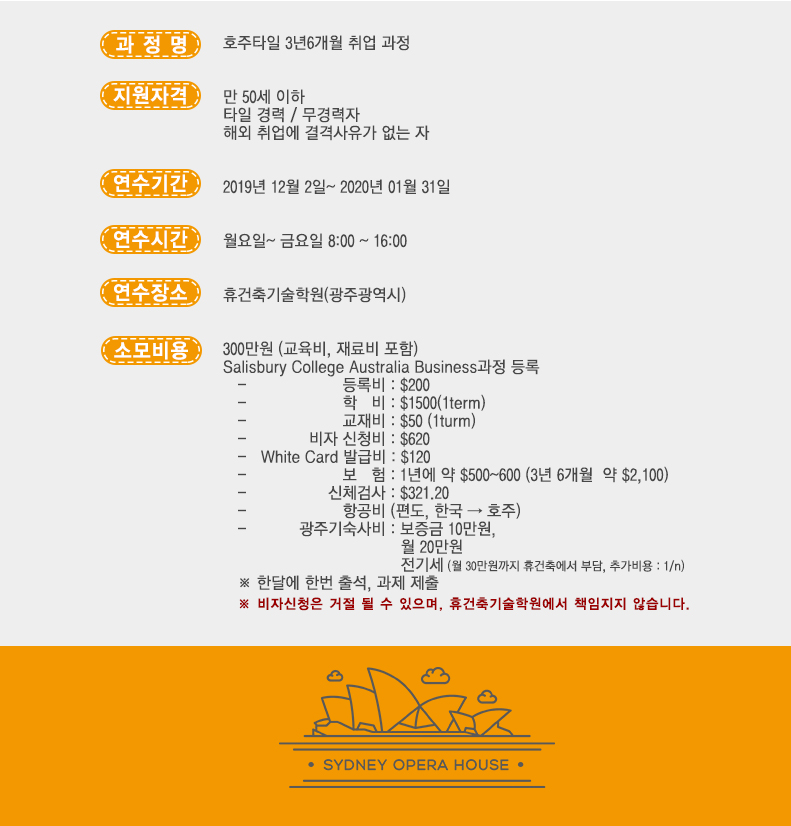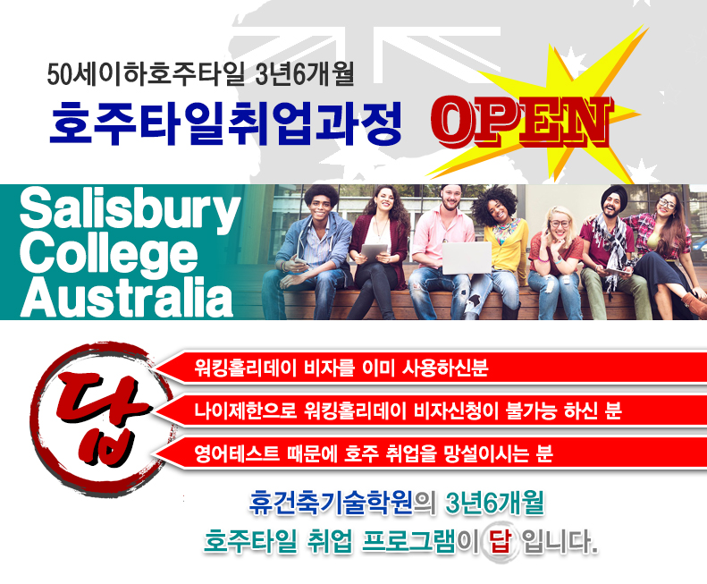 ¾È³çÇϼ¼¿ä. ÈÞ°ÇÃà±â¼úÇпø ÀÔ´Ï´Ù. ¿À´ÃÀº È£ÁַΠŸÀÏÀÏÀ» ÇÏ·¯ °¡°í ½ÍÁö¸¸ ¿öŷȦ¸®µ¥ÀÌ ºñÀÚ¸¦ ÀÌ¹Ì »ç¿ëÇØ¼ ȤÀº ¿µ¾î Á¡¼ö ¶§¹®¿¡ È£ÁÖÃë¾÷À» ¸Á¼³À̽ô ºÐµé ³ªÀÌÁ¦ÇÑÀ¸·Î ¿öŷȦ¸®µ¥ÀÌ ºñÀÚ½ÅûÀÌ ºÒ°¡´ÉÇϽźе鲲 Èñ¼Ò½ÄÀ» ¾Ë·Á µå¸³´Ï´Ù. ÈÞ°ÇÃà±â¼úÇпø¿¡¼ À̹ø 12¿ùºÎÅÍ 50¼¼ ÀÌÇÏ 3³â 6°³¿ù È£ÁÖŸÀÏ Ãë¾÷°úÁ¤À» ½Å¼³ÇÏ¿© ¿î¿µÇÏ°Ô µÇ¾ú½À´Ï´Ù. ¸ðÁý¿ä°Àº ¾Æ·¡¸¦ ÂüÁ¶ÇØ Áֽñ¸¿ä. ±Ã±ÝÇϽŠ»çÇ×Àº 1600-9826¶Ç´Â 010-6774-1601¹øÀ¸·Î ¿¬¶ôÁֽðųª »ó´ã½Åû ³²°ÜÁÖ¼¼¿ä. 3³â 6°³¿ù È£ÁÖŸÀÏÃë¾÷ ÇÁ·Î±×·¥Àº 8ÁÖµ¿¾È ±¤ÁÖÈÞ°ÇÃà±â¼úÇпø¿¡¼ È£ÁÖŸÀÏÀÇ ±âº»±³À°À» ¼ö·á ÇϽðí È£ÁÖÀÇ salisbury college australia¿¡ ÀÔÇаú ÇÔ²² ÈÞ°ÇÃà±â¼úÇпø¿¡¼ ¼Ò°³ ÇØ µå¸° ÇöÁö ŸÀÏȸ»ç¿¡¼ 3³â 6°³¿ù°£ ÀÏ ÇÏ½Ã¸ç ºñÁö´Ï½º½ºÄðÀ» ¼ö·á(1´Þ¿¡ 1ȸ Ãâ¼®, °úÁ¦Á¦Ãâ)ÇÏ´Â °úÁ¤ÀÔ´Ï´Ù.