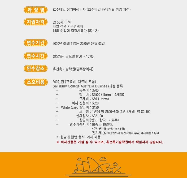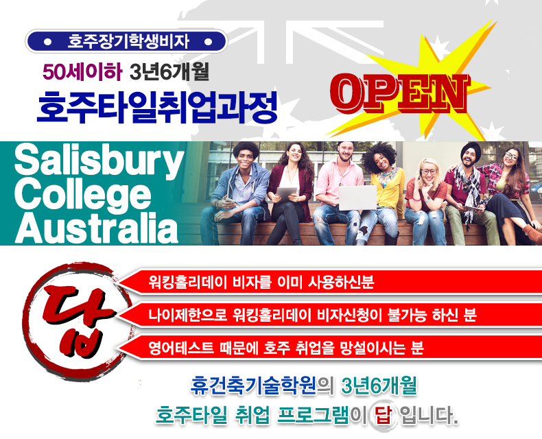 ¾È³çÇϼ¼¿ä. ÈÞ°ÇÃà±â¼úÇпø ÀÔ´Ï´Ù. ¿À´ÃÀº È£ÁÖŸÀÏ·¯·Î Ãë¾÷ ÇÏ°í ½ÍÁö¸¸ ¿öŷȦ¸®µ¥ÀÌ ºñÀÚ¸¦ ÀÌ¹Ì »ç¿ëÇØ¼ ȤÀº ¿µ¾î Á¡¼ö ¶§¹®¿¡ È£ÁÖÃë¾÷À» ¸Á¼³À̽ô ºÐµé ³ªÀÌÁ¦ÇÑÀ¸·Î ¿öŷȦ¸®µ¥ÀÌ ºñÀÚ½ÅûÀÌ ºÒ°¡´ÉÇϽźе鲲 È£ÁÖ Å¸ÀÏ·¯·Î Ãë¾÷ÇÒ ¼ö ÀÖ´Â ±³À°°úÁ¤À» ¾È³» ÇØ µå¸³´Ï´Ù. È£ÁÖŸÀÏ ÇлýºñÀÚ È£ÁÖÃë¾÷ ŸÀϱ³À° ÈÞ°ÇÃà±â¼úÇпø 50¼¼ÀÌÇÏ À̽źе鲲 ÇØ´çµÇ¸ç ÈÞ°ÇÃà±â¼úÇпø¿¡¼ 8ÁֽǽÀ°úÁ¤ÀÌ ³¡³ª¸é È£ÁÖ·Î ÀÔ±¹ÇÏ¿© ºñÁö´Ï½ºÀå±âÇлýºñÀÚ·Î 3³â 6°³¿ù°£ È£ÁÖ¿¡¼ ŸÀÏÀÏÀ» ÇÏ½Ç ¼ö ÀÖ½À´Ï´Ù. ![]() È£ÁÖŸÀÏ Àå±âÇлýºñÀÚ(3³â 6°³¿ù È£ÁÖŸÀÏÃë¾÷) ÇÁ·Î±×·¥Àº 8ÁÖµ¿¾È ±¤ÁÖÈÞ°ÇÃà±â¼úÇпø¿¡¼ È£ÁÖŸÀÏ ±âº»±³À°À» ¼ö·á ÇϽðí È£ÁÖÀÇ salisbury college australia¿¡ ÀÔÇÐÇϽŠÈÄ, ÈÞ°ÇÃà±â¼úÇпø¿¡¼ ¼Ò°³ ÇØ µå¸° ÇöÁö ŸÀÏȸ»ç¿¡¼ 3³â 6°³¿ù°£ ÀÏ ÇÏ½Ã¸é ºñÁö´Ï½º½ºÄðÀ» ¼ö·á(1´Þ¿¡ 1ȸ Ãâ¼®, °úÁ¦Á¦Ãâ)ÇϽô °úÁ¤ÀÔ´Ï´Ù.