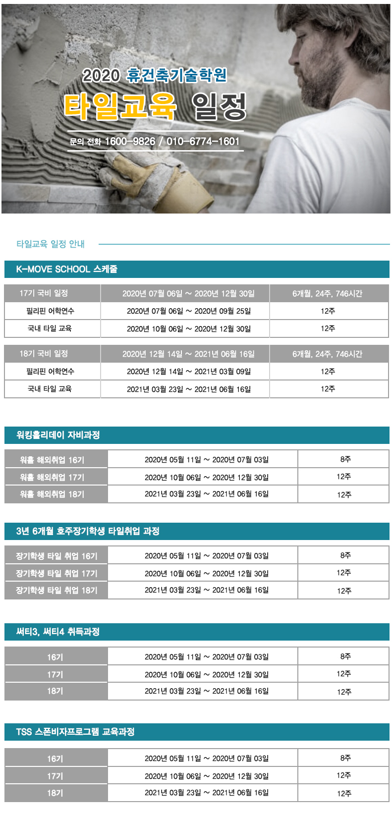 | Á¦¸ñ | 2020È£ÁÖŸÀÏÃë¾÷ ±³À°ÀÏÁ¤ ¾È³»-[È£ÁֽğÀϱ³À°,ÈÞ°ÇÃà±â¼úÇпø] |